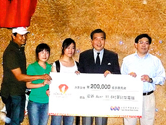 世博会台湾馆昨天下午参观人数突破20万名,台北世贸中心董事长王志刚(右二)致赠宏碁笔记本电脑给来自上海的幸运参观者顾孙丽(右三)。图片来源:台湾《联合报》