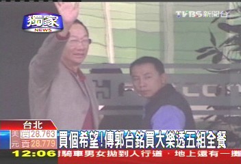 记者连续追问郭台铭有没有买彩券,郭台铭则一抹神秘微笑不予回答。有网友表示,他亲眼看到郭台铭出现在土城中央路的彩券行。记者直接也前往彩券行求证。彩券行老板娘表示,几乎可以确定就是郭台铭,当时状况就是一群人一起过来,好像是员工,他包了5个全餐。