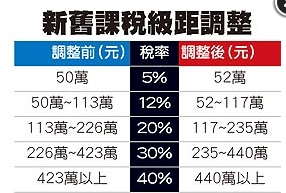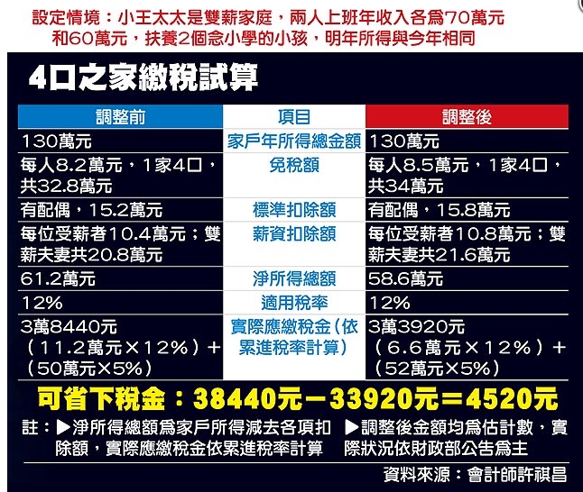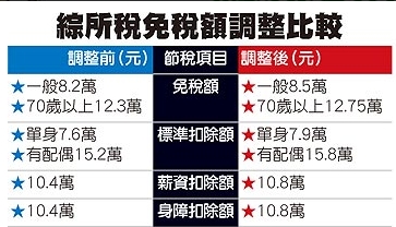 台湾资诚会计事务所会计师许祺昌昨说:“综所税各项扣除额和对应级距,受物价指数上扬连动调整,对降低税负压力会有帮助。”以双薪的4口之家而言,综所税各项扣除额提高,报税时因人数优势,会带来加乘效益,每户可抵税金额破万元,影响远大于级距调整。