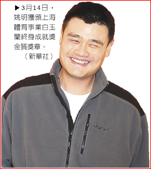 3月14日,姚明获颁上海体育事业白玉兰终身成就奖金质奖章。(图片来源:新华社)