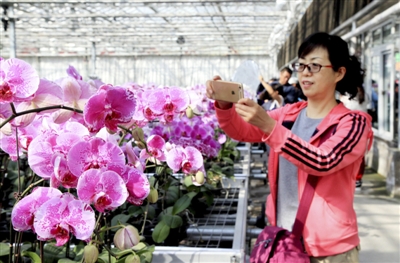 由台商投资控股的上海雍大实业有限公司与新疆生产建设兵团第六师五家渠市签订了8亿元投资协议,在五家渠市建设一个年产3000万株兰花的种植基地。目前,基地内已建成2万余平方米的展区,种植了130余种各色蝴蝶兰,主要销往我国西北地区及丝绸之路沿线各地。图为近日游客在五家渠市雍大兰花庄园游览并拍照留念。 魏新江摄(人民图片)