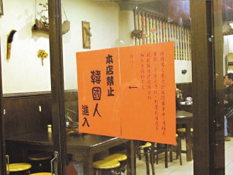 苗栗一家火锅店贴出禁止韩国人进入的告示,表达对韩国选手在东亚运跆拳赛犯规不满。图片来源:联合报