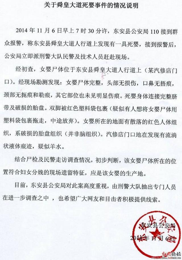 11月6日,下午14许左右,有腾讯微博网友爆料称,在湖南东安县某汽车修理部门前人行道上,有人从临近五楼扔下一女婴,孩子当场死亡。该消息随后在当地论坛上引起广泛关注,东安县警方随后进行了官方回复。在回复中,东安警方初步判断,死亡女婴连接完整脐带和被破坏的胎盘,附近有散落的人体组织,流淌的液体组织为人体羊水。警方在通报中还初步判断为“符合妇女分娩生产现场地遗留特征”。目前东安县警方已经抽调专人,正在进一步侦查中。(深度记者 朱顺忠)
