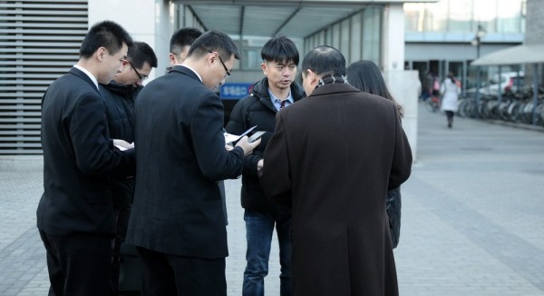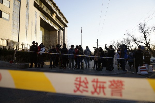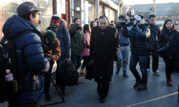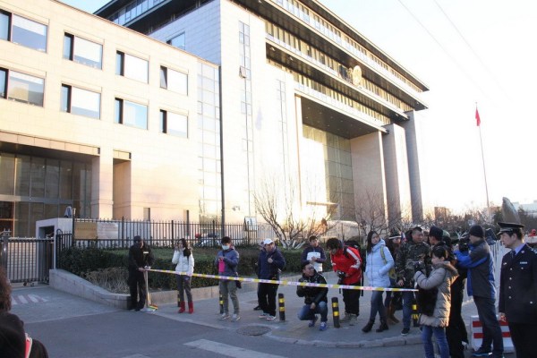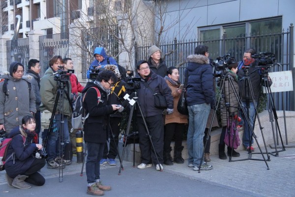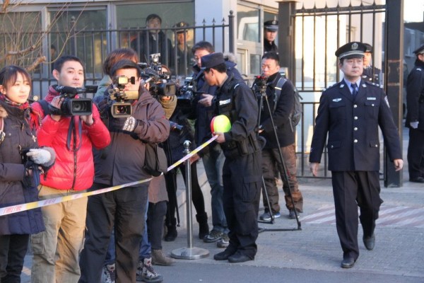 2015年01月09日,北京,房祖名容留他人吸毒一案在北京市东城区人民法院公开开庭审理。图为开庭审理前,大批媒体在东城区人民法院外守候。