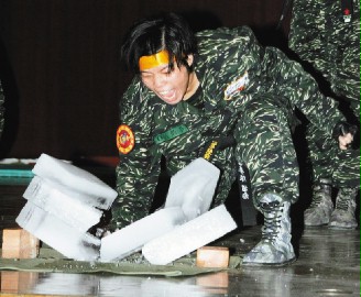 台陆军体干班将由女兵负责表演“刺枪击破”,陆战队莒拳队则由具有跆拳道五段的女兵表演破冰、破砖的猛劲。