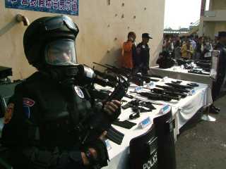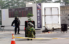 “2007金华演习实兵演练”6日在高雄市举行,假设2009年世运期间高铁左营站遭恐怖攻击,展现军警对世运维安的应变能力。图为模拟处理左营车站爆裂物。 来源:“中央社”