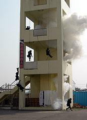 图为假设高铁左营站遭恐怖恐击,歹徒将人质挟持至附近大楼,空降维安特勤人员攻坚营救人质。