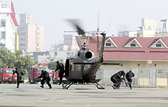 图为假设高铁左营站遭恐怖恐击,歹徒将人质挟持至附近大楼,维安特勤人员搭乘直升机营救人质。 来源:“中央社”