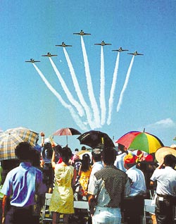 空军雷虎小组也是远东地区第一支特技飞行小组,成立初期就以精湛技术扬名国际。1957年,在菲律宾航空周首开先例九机编队表演;1959年赴美参加第一届航空表演,以九架军刀机做低空表演赢得赞誉。