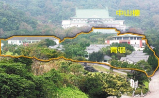 阳明山中山楼附近的建筑群,画面正后方的古典大楼即是中山楼,其余均是由“国防部”主管的青邨,黑瓦建物是当年维安人员居住的地方。图片来源:联合报