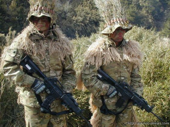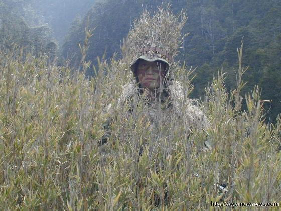合欢山一带有台湾高山短箭竹草原地形,狙击兵的身上自然要披上箭竹,而野战服也要选用土黄迷彩,作为伪装掩护,由于箭竹质地较硬,处理起来在着装时会比穿着一般草绿服时要更费时。
