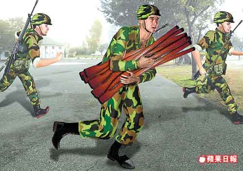 台军中尉排长以不服指挥为由恶整苏姓男兵,要他全副武装,抱11把木枪出操。图片来源:台湾《苹果日报》