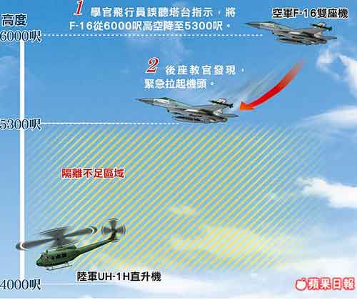 该战机在下降至5300呎时,同机随行的后座教官觉得不对劲,要求前座的飞行员再向航管确认高度;当时的航管人员也发现F-16战机未依规定在6000呎高度,也要求战机立即改正至6000呎。教官警觉有问题,立即接手飞行操作,紧急将战机拉高高度,仍差一点与在航道下方,高度约4000多呎的台陆军UH-1H直升机发生“空中接近”事件。