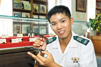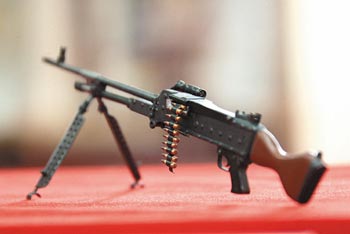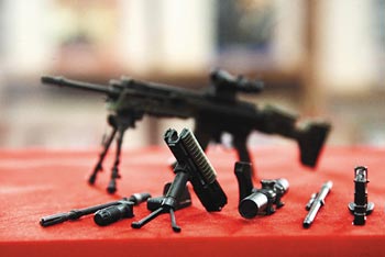 中国台湾网6月16日消息 据台湾《联合晚报》报道,台军陆军官校管理科学系四年级学生郭晋恺无师自通,用纸张为原料,做出缩小比例,唯妙唯肖的枪支模型。在他的迷你军火库中有50多种枪支,都是靠着一把刀、一张纸、瞬间接着剂做出来的,比起日本模型公司出品的枪支模型毫不逊色,陆军官校还为他举行个展。