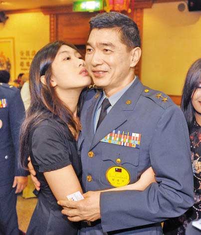 荣耀时刻台军晋任授阶典礼29日上午举行,首位马祖东引岛出身的台军中将陈宝余(图右)在典礼过后,貌美的女儿特别趋前亲吻脸颊表达祝贺。图片来源:台湾《中国时报》