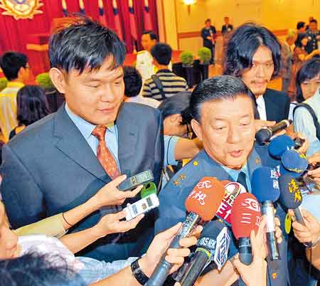 晋升中将、身材壮硕的毕学文在接受媒体访问时,后面高壮的儿子像左右护法一般,分享毕学文的喜悦。图片来源:台湾《中国时报》