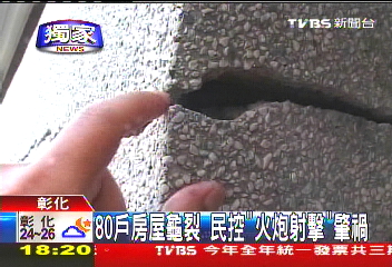 彰化县大庄村民表示,火炮射击威力巨大,伴随剧烈震动,不仅震落了房屋磁砖,房屋的天花板、客厅地板、外墙均布满大大小小的龟裂痕迹。一位村民表示,他的2层小楼整个都被震裂,裂缝非常大,如果有地震发生,一定会被吓死,不敢再住。
