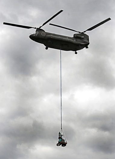 台湾苏花公路搜救任务26日持续进行,台军上午以CH-47型双主旋翼直升机吊挂小型挖土机,从宜兰运动公园起飞进入112.8公里处海岸。