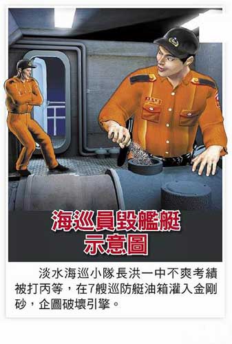 前年11月27日,洪一中(43岁)因不满先前喝酒被上级惩处,年终考绩只有丙等,伙同分队长李文波(45岁)共谋将硬度极高的金刚砂倒入7艘平均造价7000万新台币)的巡防舰艇引擎,企图破坏引擎报复。幸好海巡队在保养时及时发现,耗费65万元新台币逐一检查清除,才避免船只损坏。