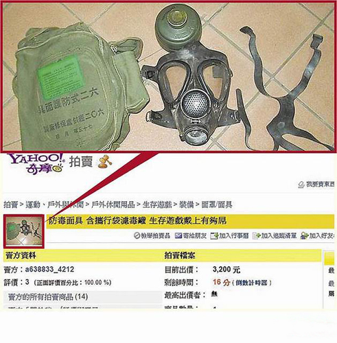据台湾媒体报道,台湾网友爆料指出,因日本核灾,他原想在Yahoo!拍卖网站搜寻防毒面具,欲采购寄送日本友人,却看到台军制式装备防毒面具在网络上拍卖,一名署名“a638833-4212”的卖家,拍卖台军制式防毒面具,甚至吹嘘戴上这种防毒面具玩生存游戏,“有够屌”。卖家除卖防毒面具外,还出售携行袋及滤毒罐,共3200元新台币。