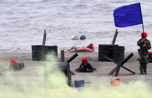 据“中央社”报道,台军2011年度“汉光”演习11日在挖子尾营区登场,假想敌军从淡水河口登陆,陆军六军团关渡指挥部进行反突击、反渗透作战,原排定的攻击直升机则因天候不佳,无法起降。