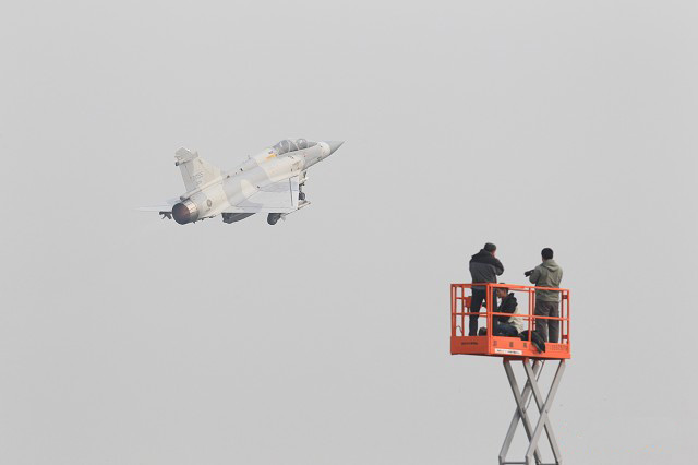 图为台“汉光27号”演习,幻象2000起飞,军事迷租用吊车拍照。图片来源:台湾媒体