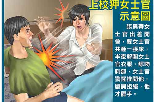 台军受害女士官指控,2008年11月,张男(49岁)利用权势将她调到作战中心,成为她的直属长官,再以她有多名台军官追求,交往复杂影响公务为由,保管她的手机SIM卡,并趁机查看她的通话记录和短信内容。她说,同年11月至2009年3月,张男假借洽谈公事或共同参加战情讲习,先后5次安排与她同住仅有一张双人床的汽车旅馆或商务旅馆。其中一次,张男趁她睡着后对她强吻、摸胸、吸奶,她惊醒后推开张男严词拒绝,张男才停止。