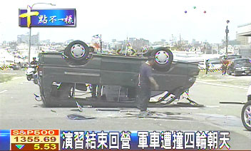驾驶军车的驾驶兵说,他们才刚结束演习任务,要回到营区,却被一辆白色轿车从侧边撞击,导致翻覆,驾驶兵和押车的中校军官都受到轻伤,不过没有大碍。