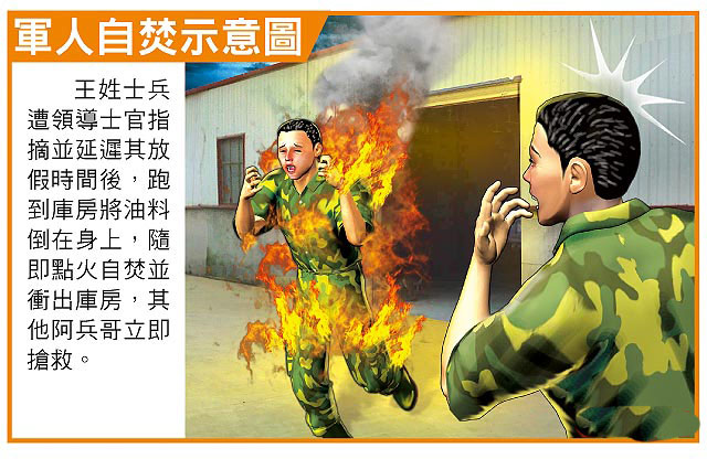 台军一名王姓士兵因不满领导要延后其放假,愤而浇汽油自焚。图片来源:台湾媒体