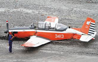 中国台湾网5月30日消息 据台湾《联合报》报道,昨天上午,台空军军官学校一架T-34C教练机进行例行训练,起飞10分钟后,疑因机械故障在空中熄火,紧急迫降高屏溪高树大桥旁河川地,幸好教官赖纹由及学员陈厚郡均平安。