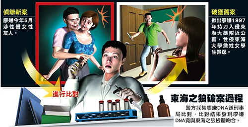 中国台湾网8月14日消息 据台湾媒体报道,14年前震惊台湾各界的“东海之狼”,不仅让多名女大学生受害,检警还抓错人险造成冤狱。台中市警方今年5月受理一件性侵案时,意外比对出嫌犯的DNA与“东海之狼”性侵案检体吻合,12日揪出真正的恶狼,竟是一名台当局海事部门士官廖泰余。廖嫌13日供出,当年一共犯下4起女学生性侵案,面对媒体还崩溃大喊:“对不起!”晚间遭台军事法院中部分庭裁定收押,台中海巡局也将其停职。