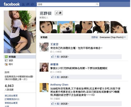 范群侦的粉丝专页一上线已有近5000人按赞,相簿则搜集了范侦群超过300张的性感照片,不少网友声援她,赞她很有勇气,还说她若出写真集必买。(中国台湾网 冯江)