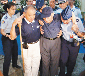 常建国85岁的老父(右二)离开灵堂时,难过到走不动。图片来自台湾《联合报》