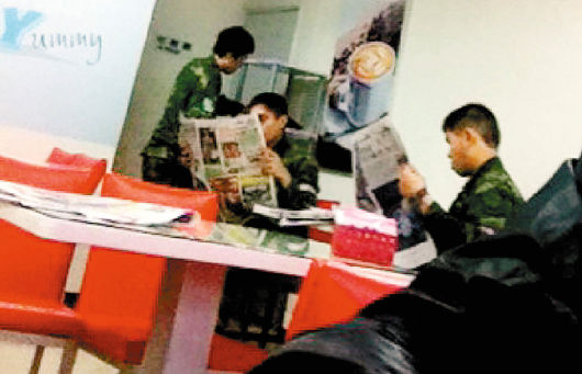 媒体报道,民众提供照片并指出,台军参演部队中,有穿着野战迷彩服、戴着演习蓝色臂章的官兵,于“汉光演习”期间在早餐店悠闲看报吃早餐。