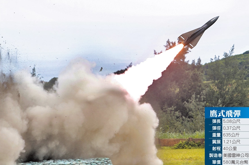 今年度最大规模的台军三军联合实弹射击,原本要测考的精准武器有天弓二型防空导弹、鹰式防空导弹、响尾蛇空对空导弹、车载天剑一型防空导弹以及雄风一、二型反舰导弹、标准一型防空导弹、云母空对空导弹、小牛空对地导弹等。