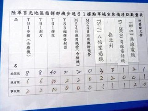 据报道,台军方严禁携带照相手机进入营区内,但日前却有一张马祖陆军莒光地区指挥部61据点的武器清点表在网络上流传,照片中包括武器配备数量与妥善率一览无遗,引发网友讨论。