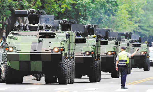 中国台湾网5月29日消息 据台湾《联合报》报道,台当局领导人马英九昨天首次搭乘台军“云豹”装甲车,从其办公地点前往位于台北市大直的“政军指挥中心”参加“政军兵棋推演”。