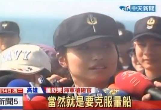 董舒雯是海军官校第一位自费生毕业后转服志愿役的女军官,目前负责枪炮人员管理和装备操作维护督导。她接受媒体联访时说,“一开始上船最艰苦的地方就是要克服晕船,克服晕船之后,就可以学习到其他所有东西。”