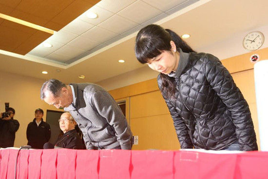 台湾陆军航空特战部军官劳乃成的父亲劳则康(左)、姐姐劳乃慧(右)今天上午在台大校友会馆开记者会,对于阿帕奇风波鞠躬致歉。图自台湾“中央社”