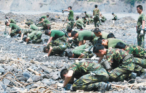 在六龟乡新开部落搜救的台军官兵,昨天趴在可能埋尸的泥石流现场,用鼻子闻土壤中有无酸味,再用铲子挖土,希望找到罹难者遗体,可惜尚无所获,“虽然很累,但为了罹难者也要拼下去。”
