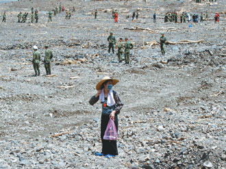 六龟新发村新开部落31人被活埋,台军为寻找罹难者遗体,连鼻子都用上了,为防止疏漏,士兵排成一列趴在土石上一寸寸地闻,遇有异味再开挖,令人感动。图片来源:台湾《联合报》