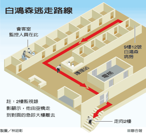 据悉,前天中午白鸿森还和小女儿共进午餐,但两名警员却未跟随在旁,白鸿森趁警员平日松散、疏于戒备,直接从九楼病房走出来,三两步踱越长廊,走进病房正对面的安全梯,拾级而下到二楼,再往门诊大楼方向,宛如走自家后院般,一路畅行无阻,扬长而去。
