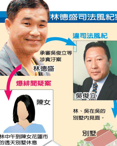 花莲高分院上个月将林德盛调查报告及建议惩处资料呈报“司法院”,但被退回要求再查明,花莲高分院上周已呈报“高等法院”转呈“司法院”。台“司法院秘书长”谢文定表示,如确定林德盛行止不当,影响“司法”形象,“司法院”一定不会纵放。花莲高分院认为林德盛违反法官守则,建议记一大过,台当局“司法院”将召开人审会讨论。至于这件“司法”风纪案是否涉及刑事犯罪,台当局“最高检察署”将发交花莲地检署,指挥调查局东机站侦办。吴俊立贪污案审判长何方兴强调,因林德盛不当与吴俊立私下接触,已要求他回避不再审理本案。(刘海伟)