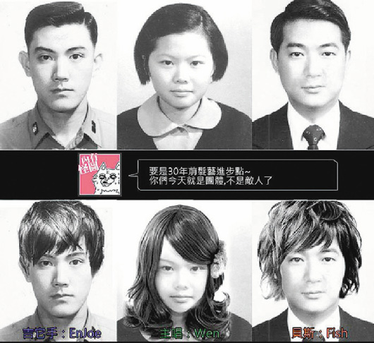 三位2012年台湾地区领导人候选人年轻时期的照片,显得腼腆、青涩,就有网友用修图软件kuso(恶搞)照片,帮三位候选人改变了新潮的发型,网友说,“要是30年前发艺(理发技术)够进步,他们现在就不会是敌人,而是乐团团体。”有网友说,马英九从年轻到现在都很帅,有人说他换上新发型之后,长得像彭于晏,有网友夸赞蔡英文换了发型之后,脸变小、也变漂亮了!