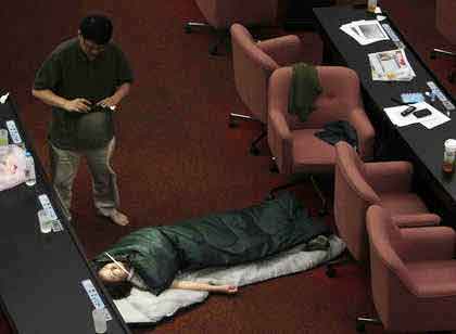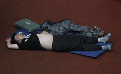 段宜康则自备露营专用的睡垫和枕头,但熟睡后踢被,还露出一大截肚子,也全被民进党内同志们拍下照片。(中国台湾网 刘海伟)