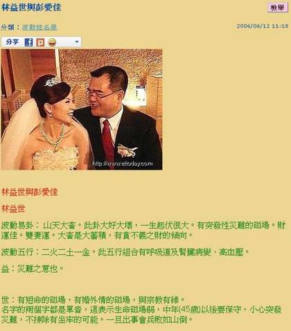 昵称悲憨居士的网友在部落格中分析姓名,网页出版时间为2006年6月12日,他以林益世和彭爱佳的名字进行分析,写到林益世属“山天大畜”卦,此卦大好大坏,一生起伏很大。有突发性灾难的磁场,有贪不义之财的倾向。