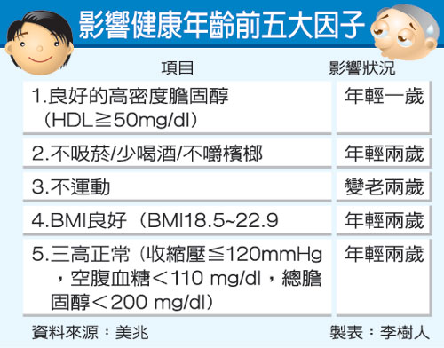 整体来说,美兆年度健康检查报告显示,岛内民众整体“健康年龄”比实际年龄年轻1.4岁,女性表现较男性佳,平均年轻2.8岁。如以地区来分,北部民众“健康年龄”最年轻,平均比实际年龄少1.71岁,其中北部女性表现最佳,“健康年龄”比实际年龄平均年轻3.08岁。