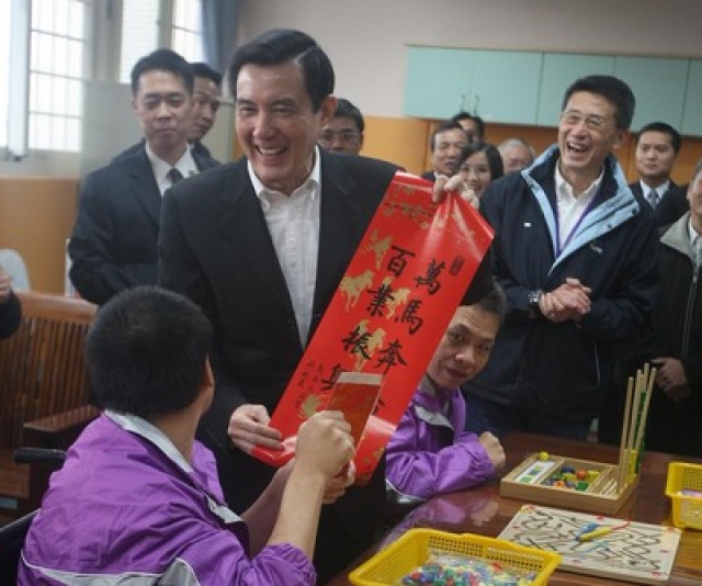 中国台湾网1月13日消息 据台湾今日新闻网报道,马英九周日(12日)前往阳明教养院发春联,在院长孙丽珠告诉院生春联上的字都是马英九亲自提的时候,马英九却说,“有3个字不是我写的”;让大家正一脸狐疑,马才解释说:“吴敦义。”