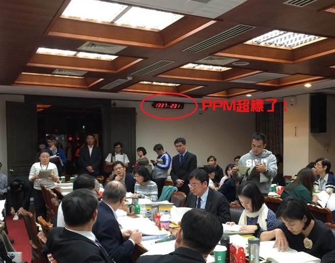 她公布“立院教育文化委员会”开会时的纪录显示,一群人闷在会议室里讨论,不知不觉间空气中的二氧化碳浓度便冲1300PPM。而根据“环保署”公布的数据,室内二氧化碳浓度达700PPM时,就会感觉空气污浊与引起不舒适感,达到1000PPM以上时,则会令人感到困顿疲倦。