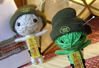 报道说,这只“倒扁娃娃”,带着象征“阿扁娃娃”的“扁帽”,不过帽子上的“扁”字是颠倒的,还有一支大头针,正中娃娃的头,讽刺意味相当浓厚。